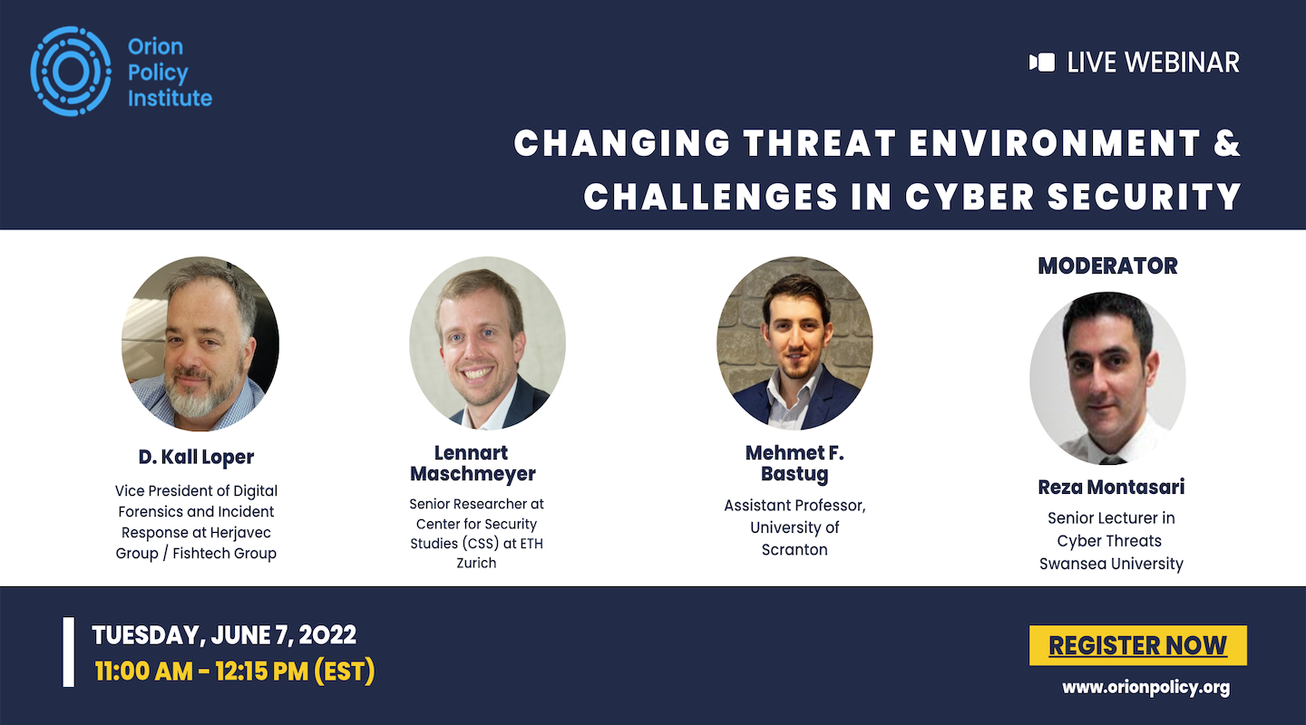 Orion Policy Institute hosted a live webinar on the changing threat environment and challenges in cybersecurity. The speakers included: Dr. D. Kall Loper, Vice President of Digital Forensics and Incident Response at Herjavec Group/Fishtech Group Mehmet F. Bastug, Assistant Professor at the University of Scranton