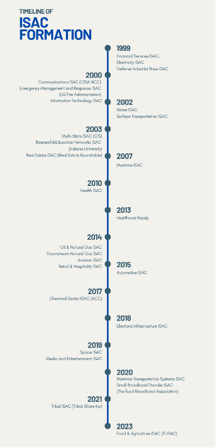 Over the years, companies in most critical infrastructure industries took the initiative to create their own ISACs, with Financial Services, Information Technology, and National Defense as some of initial ones. In some cases, organizations took the lead to expedite the establishment of ISACs such as the North American Electric Reliability Corporation (NERC) for Electricity ISAC, the CISA National Coordinating Center (NCC) for Communications ISAC, and the US Fire Administration for Emergency Management and Response ISAC.