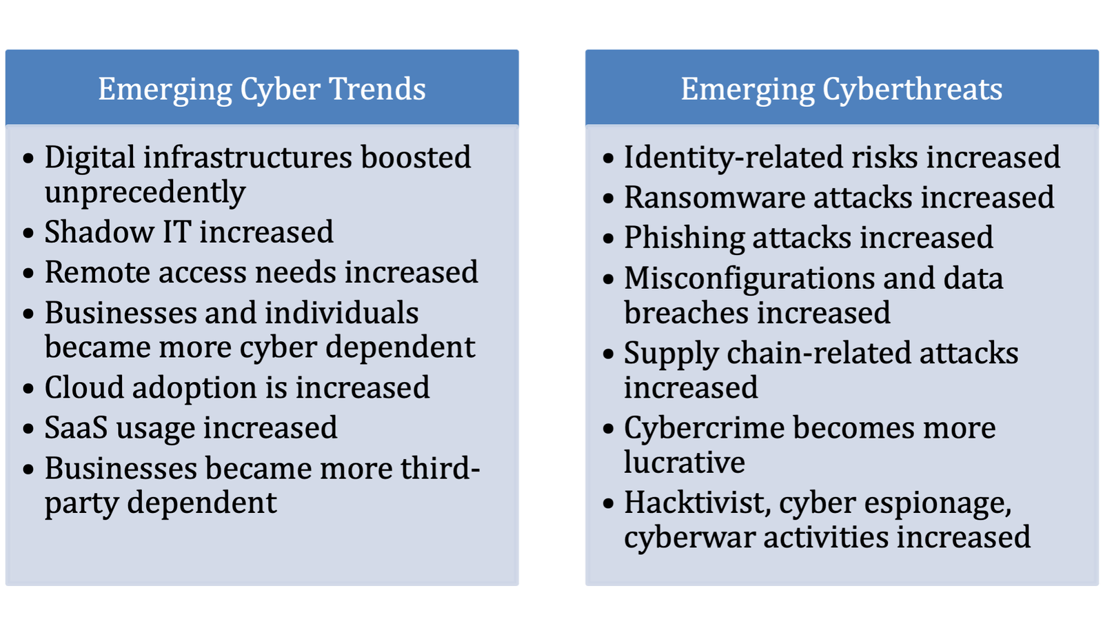 Covid has made big transformations in our lives and affected cyberspace. Online shopping has increased by 55%, the number of remote workers has tripled, and education has gone increasingly online in the US. These changes have caused an unprecedented boost in digital infrastructures, making businesses and individuals more cyber dependent.