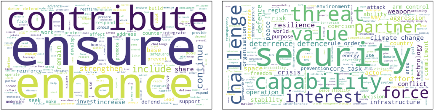 Figure 1. Word cloud for verbs (left) and nouns (right) in Strategic Concept.